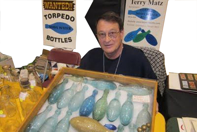 the Canadian is every year “The Torpedo Bottle King” of the Toronto Bottle Show. Specializes in all manner items relating to torpedo bottles including molds and pressure guages. He has a lot of coloured glass on his table, pontiled glass and early stoneware and other Canada West trade merchandise. His reference-site for eggbottles is a must seen: http://www.torpedobottle.com