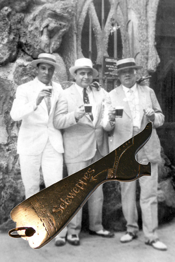 The leading fullrange-segment of softdrinks: a Schweppes portfolio 1906. The stylish cap-lifter powered a brandnew innovation: the crown-cork. Introduced by Schweppes in 1905.