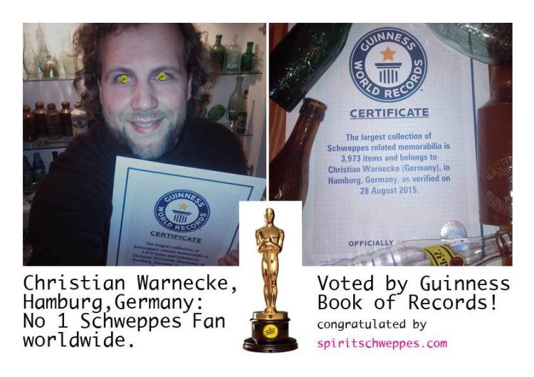 Christian, my friend and Schweppes collector, proudly presents “The Schweppes Globe”, purchased by auction in Australia, and his certificate for the Guinness book of records (!)