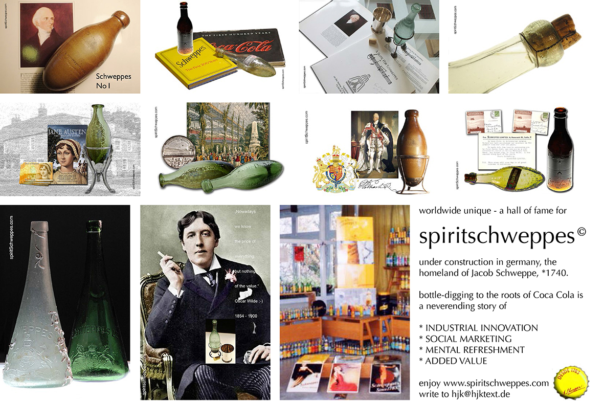 However, the traces of the author and his original documents and museum artifacts seem to have disappeared. Or maybe they are not open to the public. That is why there is not any “Soda hall of fame” anywhere in the world to honor the achievement of the godfather of all soft drinks. Schweppes does not have a home where, like in Germany, the smallest beer label becomes an authentic experience: the brewery, historic buildings, local museums, a collection. Not to mention the Marketing-Mecca in Atlanta. There is no hands-on experience, just a book, at least antiquarian.