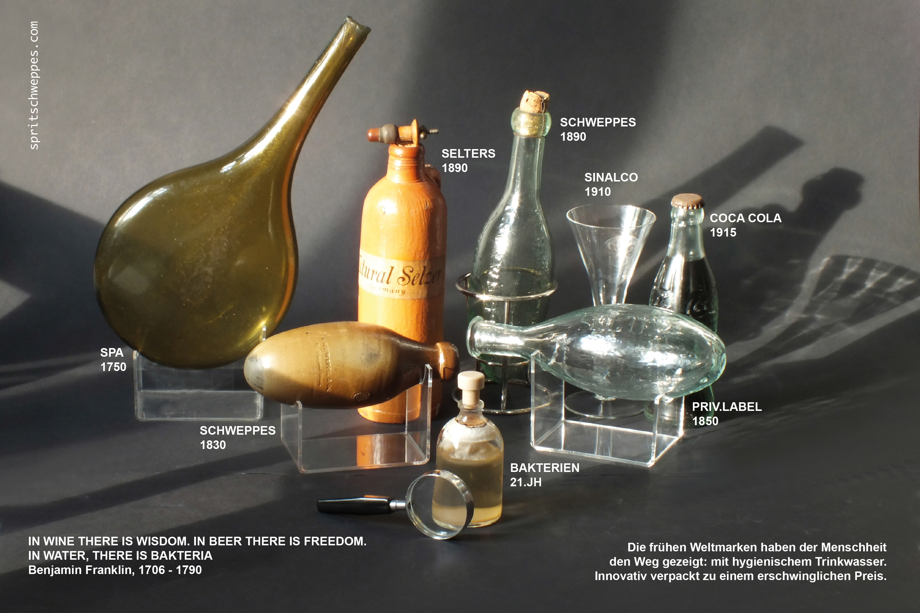 Yesterday on the 22nd of March the international WORLD DAY OF WATER has passed almost unnoticed. He had the guiding theme “leaving no one behind – water and sanitation for all”. As late as the 18th century, Benjamin Franklin, the American scholar, publicist and politician said: IN WINE, THERE IS WISDOM. IN BEER, THERE IS FREEDOM. IN WATER, THERE IS BAKTERIA. The photo from my marketingcabinet spiritschweppes.com should pay tribute to the historic drinking water pioneers. SPA 17 / 18C, SELTERS / SCHWEPPES 18 / 19c, SINALCO / COCA COLA 20c. These first global players in carbonated, hygienic drinking water have taken humanity a long way to the development of water and sewer systems (end19C). With safe drinking water at an affordable price – innovatively packaged in the world’s first bottles. In the foreground: water bacteria, made visible.