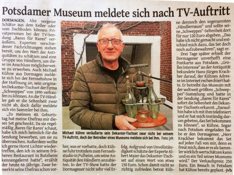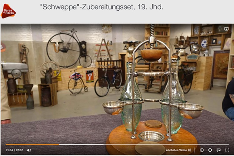 THE BIRTH OF THE “LIMEYS CLUB”. Horst Lichter’s “Bares for Rares” is the most popular antique show on German television. In January 2019 an original Schweppes decanter appeared there. Fitted with two eggbottles incl. cork stoppers: J. SCHWEPPE & CO.LTD • LONDON • EAUX ARTIFICIAL. • (fountain of great exhibition 1851) TRADE MARK. The experts and dealers could not agree on a purchase. www.spiritschweppes.com -storyteller Hans-Jürgen Krackher and his collector friend Christian Warnecke (No.1 Schweppes-Collector in the Guinness Book) reckoned the seller and agreed on the purchase. The original Schweppes decanter from about 1890 with embossing bottles in English-French is now a star of the digital spiritschweppes-collection. all nice followers are cordially invited to live-tasting at Hans-Jürgen Krackher’s Marketing-Cabinet in Potsdam / Germany.