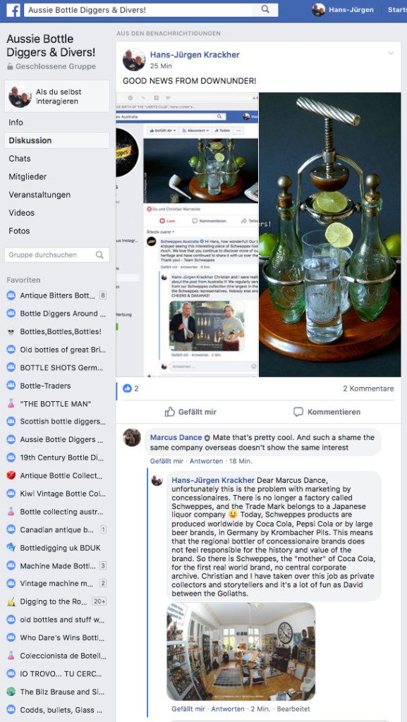 Hans-Jürgen Krackher Dear Marcus Dance, AUS, unfortunately this is the problem of marketing by concessionaires. J.Schweppe since 1783, Schweppe´s Ltd, Cadbury Schweppes, the British roots – the values of the first real world brand – everything has gone. There is no longer a factory called Schweppes, and the Trade Mark belongs to the Japanese liquor company Suntory. Today, Schweppes products are produced worldwide by Coca Cola, Pepsi Cola or by large beer brands, in Germany by Krombacher Pils. This means, that the regional bottler of concessionaire brands do not feel passionately responsible for the history and value of the brand. So there is for Schweppes, with Spa and Selters the genetic “mother” of Coca Cola, no central corporate archive. Christian and I have taken over this job as private collectors and storytellers and – it’s a lot of fun as Davids between the Goliaths.